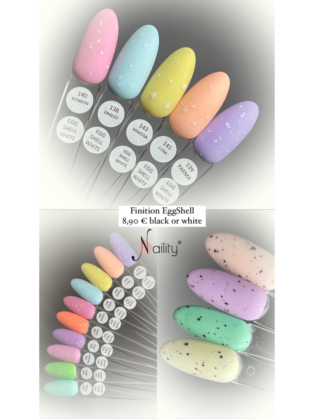 Finition semi-permanent mate effet « velours » avec des petits « flocons » blancs, sans résidu après catalysation, ne se dégraisse pas.